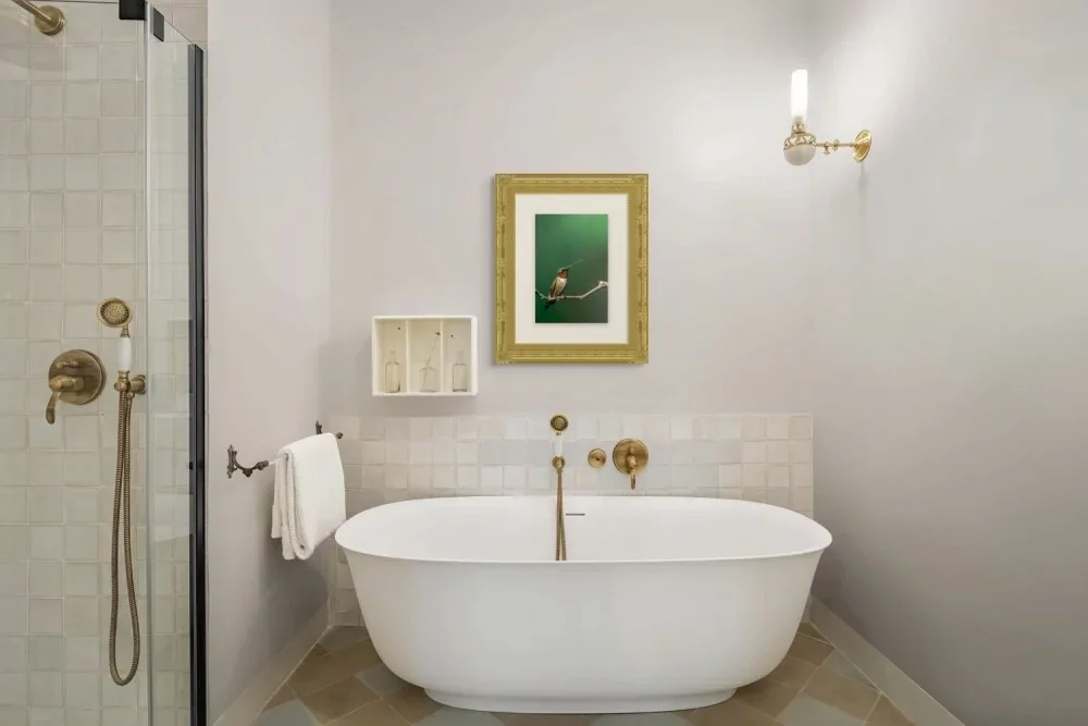 Even the smallest spaces can benefit from intentional art. A series of small, nature-inspired prints can make your bathroom feel like a spa retreat. Think delicate feathers, misty treetops, or birds mid-flight—evoking air, movement, and light.