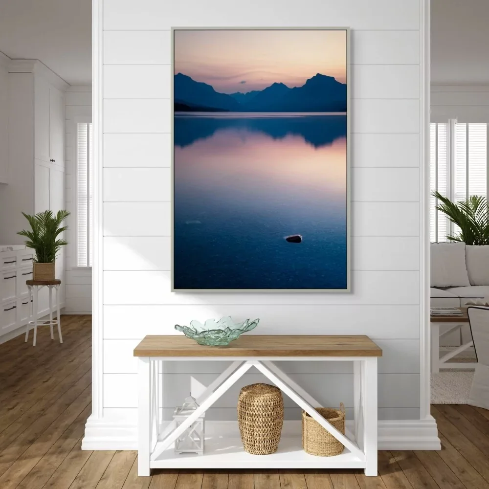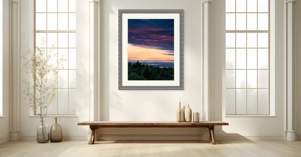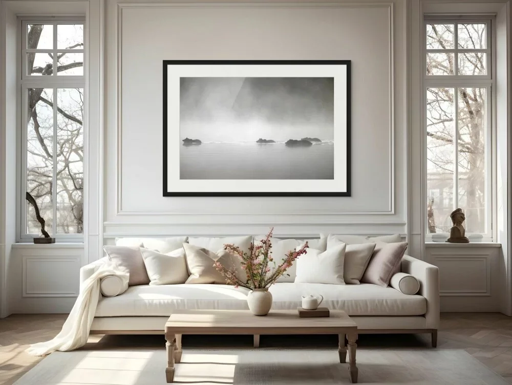 Tip: Canvas or acrylic prints soften reflections and pair beautifully with natural fabrics and textures.